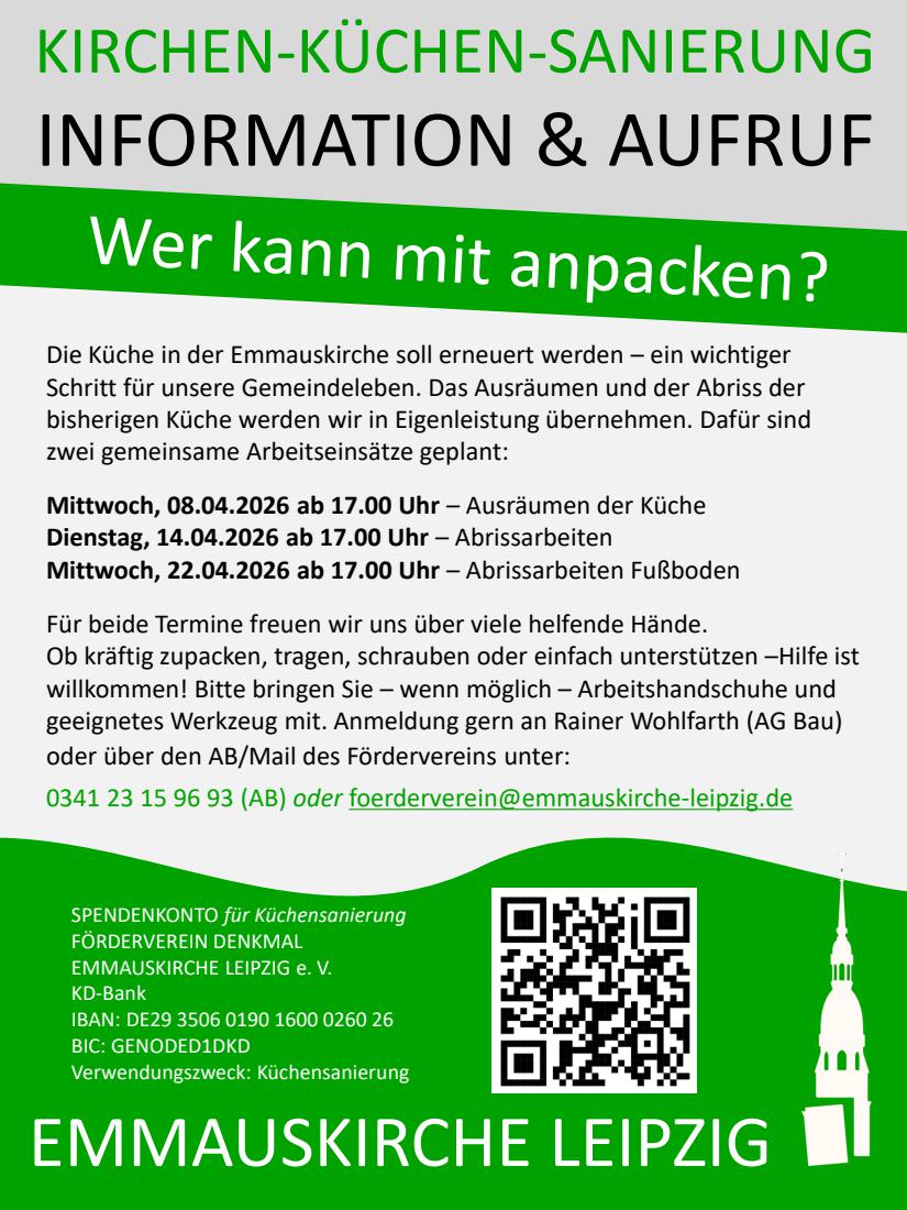 Nun steht das nächste, schon oft verschobene, wichtige Projekt an: die grundlegende Erneuerung der Küche in der Emmauskirche. Seit über 40 Jahren leistet sie treu ihren Dienst – bei Gemeindefesten, Veranstaltungen, Treffen von Gruppen und Kreisen. Viele schöne Begegnungen sind hier entstanden. Doch nun ist sie technisch und baulich an ihre Grenzen gekommen. Erste Planungen liegen vor, ein Bauleiter ist beauftragt und ein Bauantrag bei der Landeskirche gestellt. Die geplante Sanierung umfasst die Erneuerung der veralteten Elektrik aus DDR-Zeiten, einen neuen Fußboden sowie neue Wasser- und Abwasserleitungen. Die geschätzten Gesamtkosten belaufen sich auf ca. 45.000 Euro.